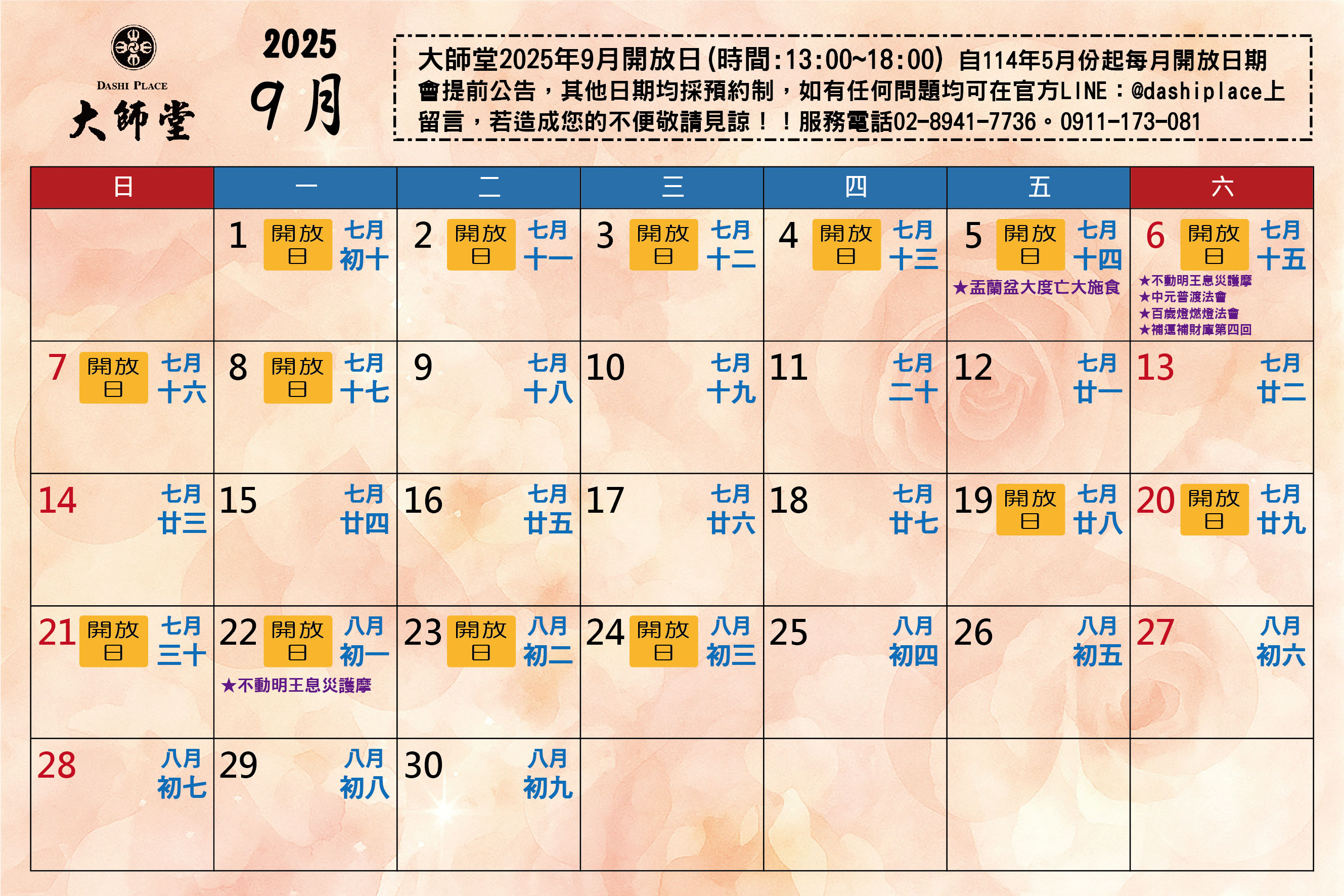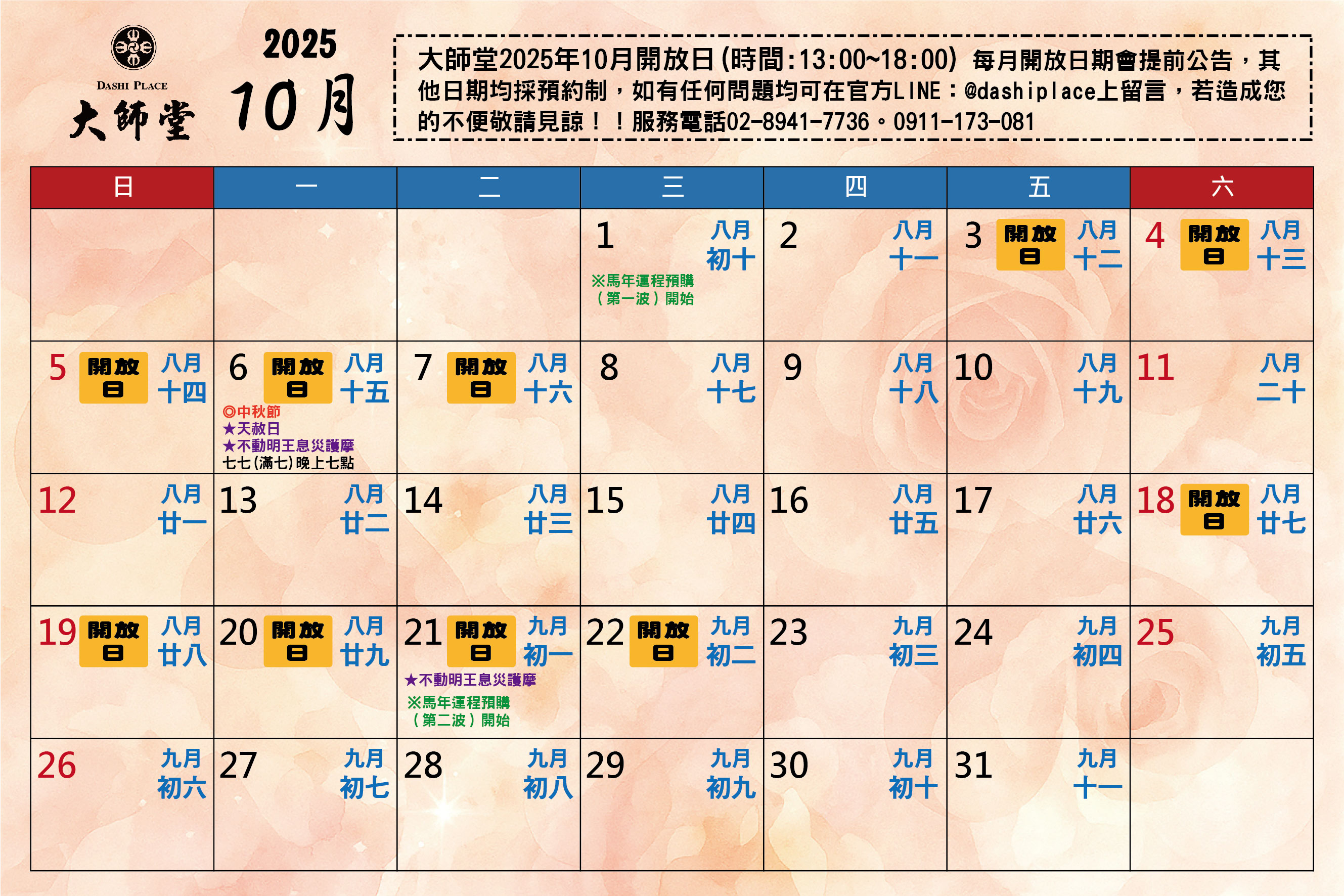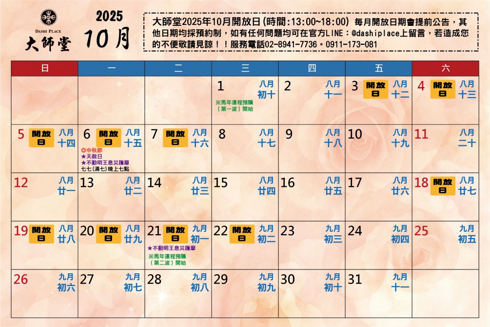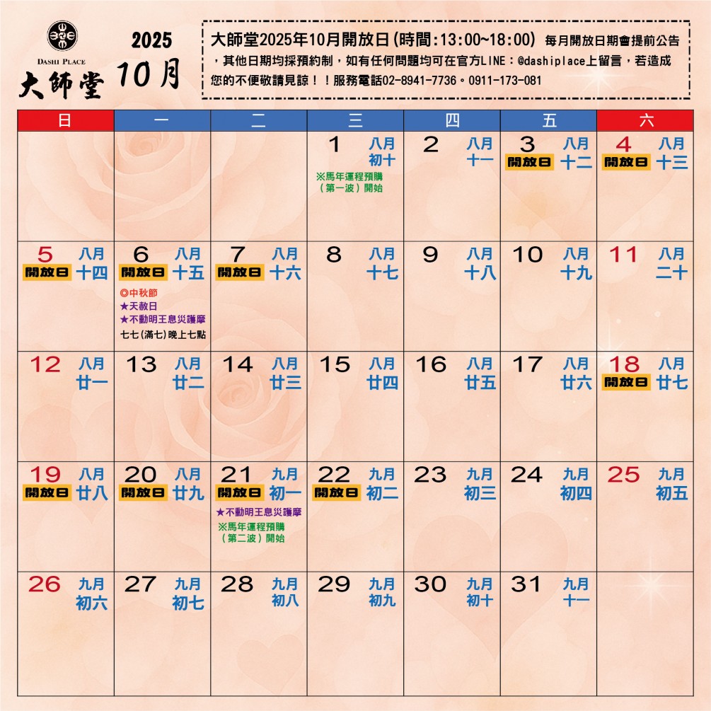 大師堂 自114年5月份起每月開放日期會提前公告,其他日期若想到大師堂參拜及購物均採預約制,如有任何問題均可在官方LINE@dashiplace上留言,購物亦可上官網下單購買。若造成您的不便,敬請見諒!服務電話02-8941-7736。0988-722-138