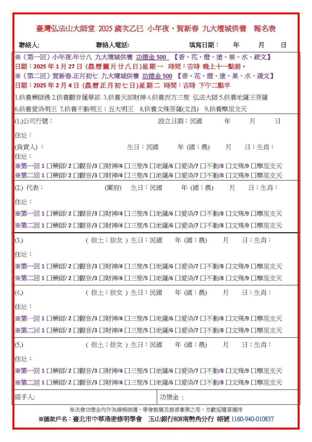 2025歲次歲次乙巳蛇年 九大壇城供養【第一回:小年夜年廿八 日期:2025年1月27日 時間: 晚上十一點前 】【第二回:賀新春正月初七 日期:2025年2月4日 時間:下午二點半】 報名截止日:114年1月23日