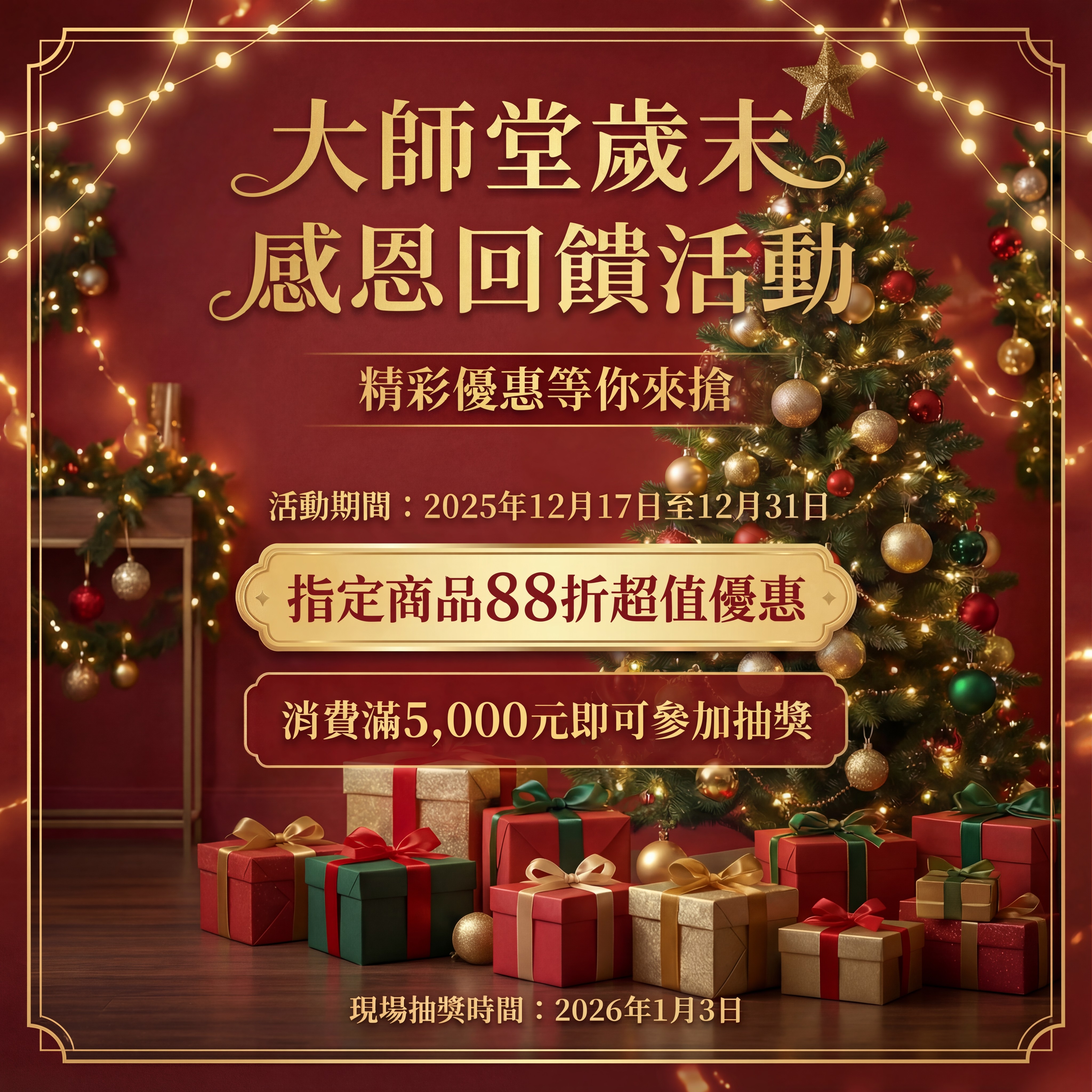 親愛的會員們,一年一度的聖誕佳節即將到來!大師堂為感謝大家的支持與厚愛,特別舉辦「聖誕歡慶回饋活動」,豐富好禮與超值優惠等你來參加!