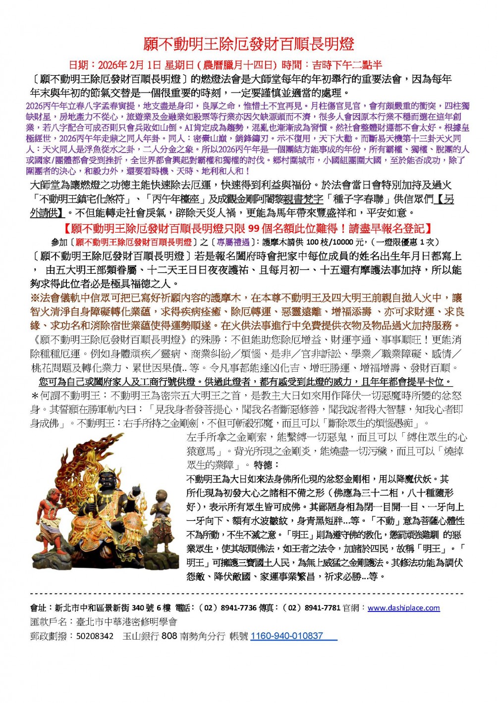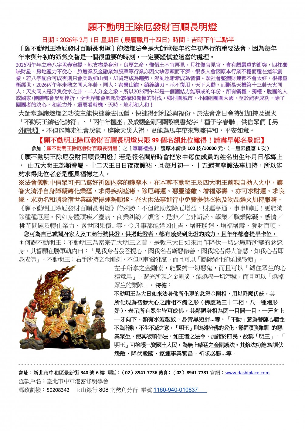 願不動明王除厄發財百順長明燈 燃燈大法會 日期:2026年2月1日(乙巳年臘月十四日)星期日 時間:吉時下午二點半