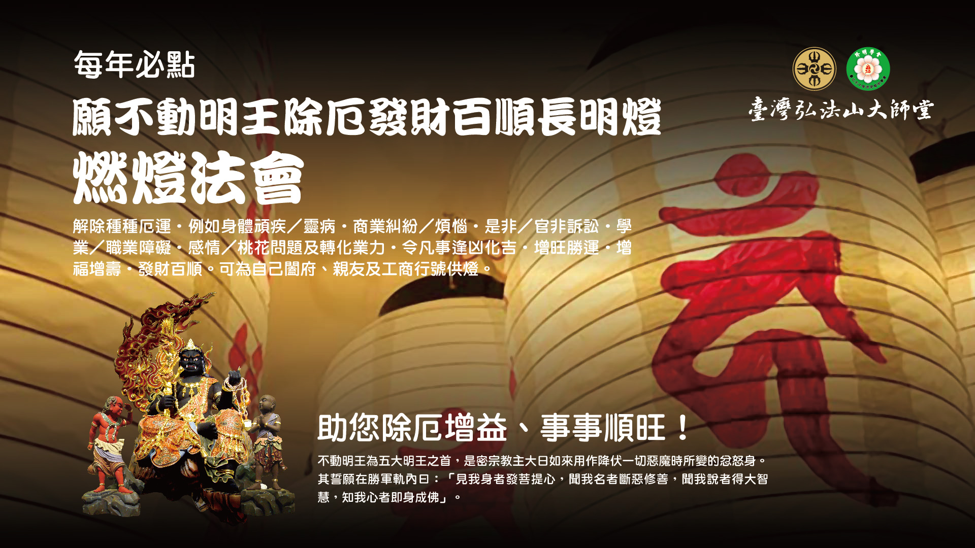 〔願不動明王除厄發財百順長明燈〕是大師堂每年的年初舉行的重要法會,因為每年的年終與年初節氣交替是一個很重要的時刻,一定要謹慎並適當的處理。