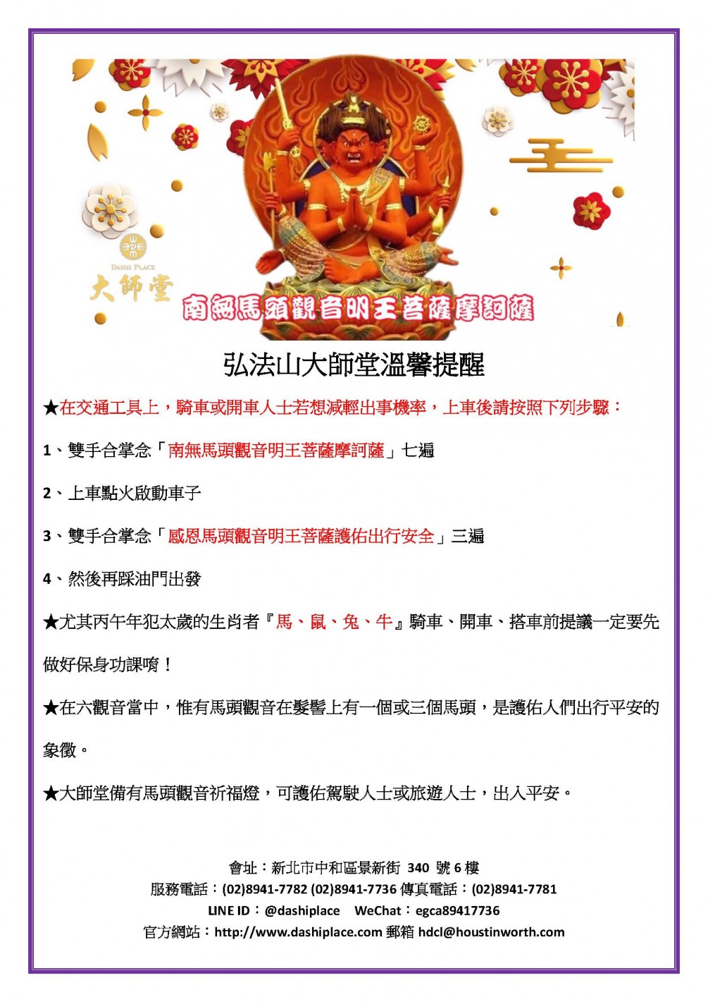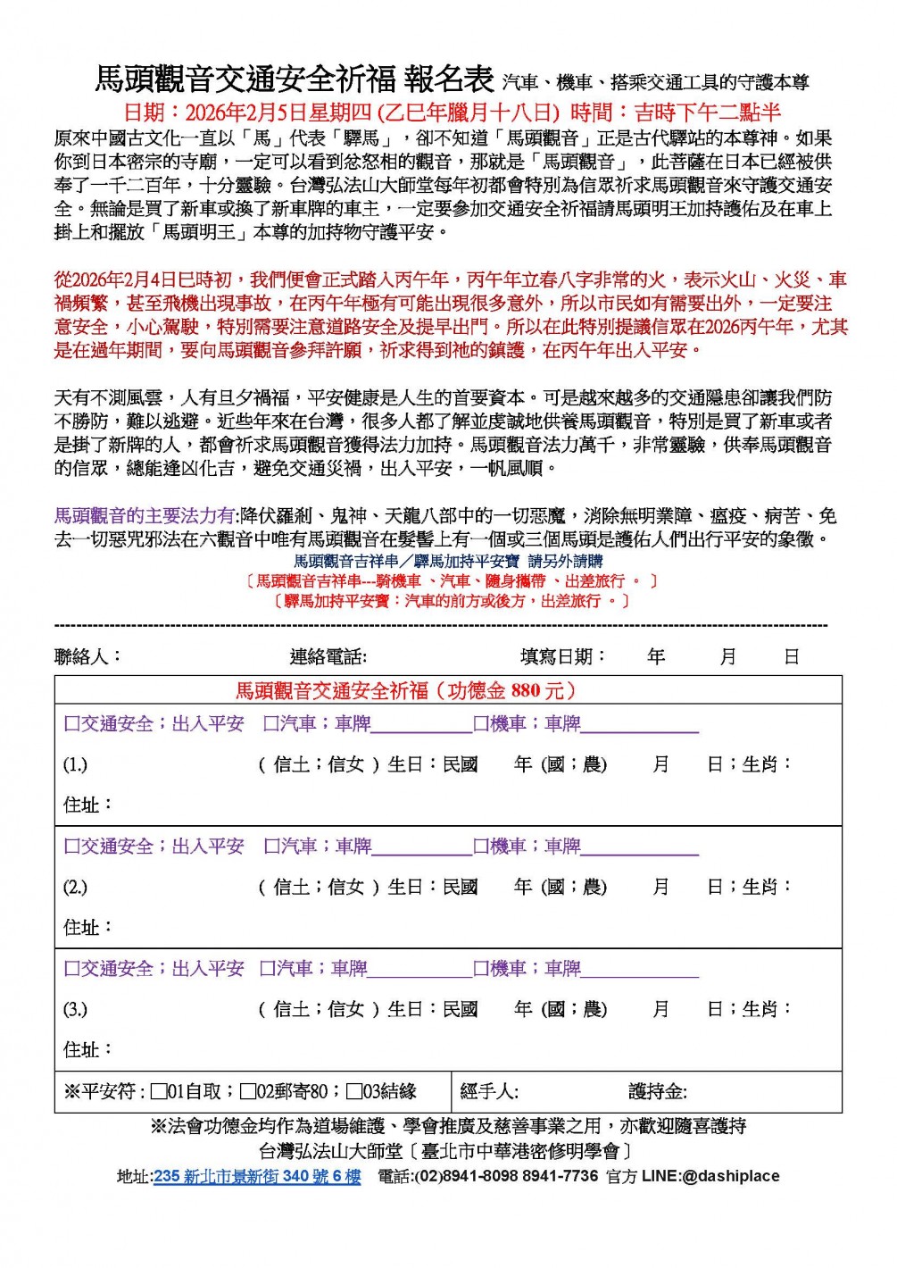 馬頭觀音交通安全祈福 日期:2026年2月5日星期四 時間:下午二點半 報名截止日:2026年2月2日
