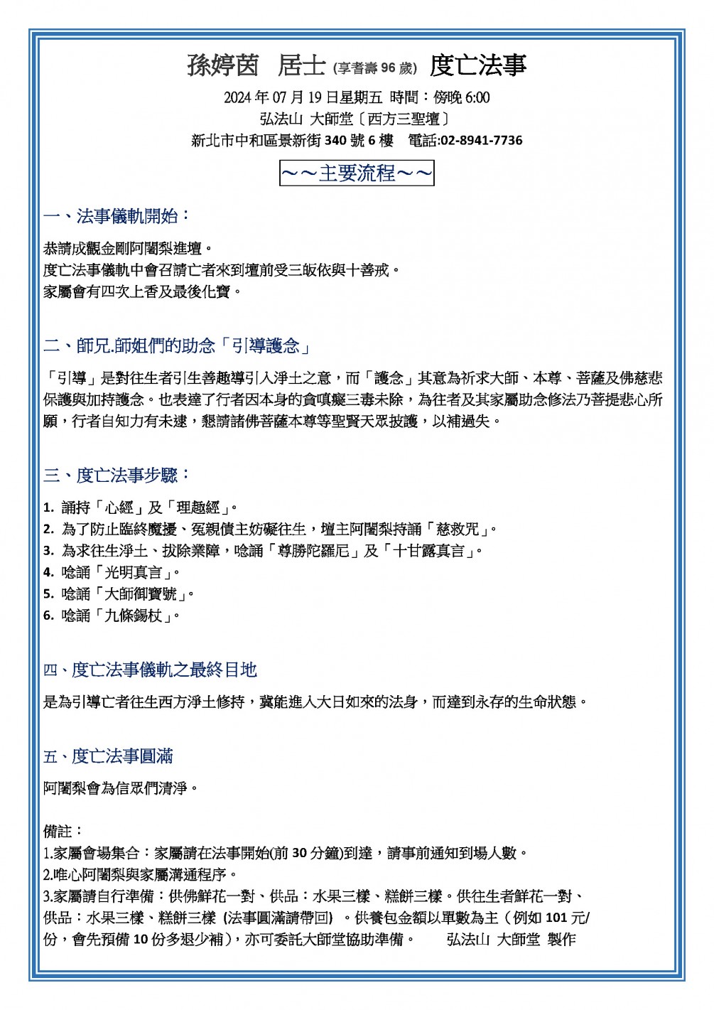 度亡法事公告【孫婷茵 居士 】 佛事訂於2024年07月19日 星期五