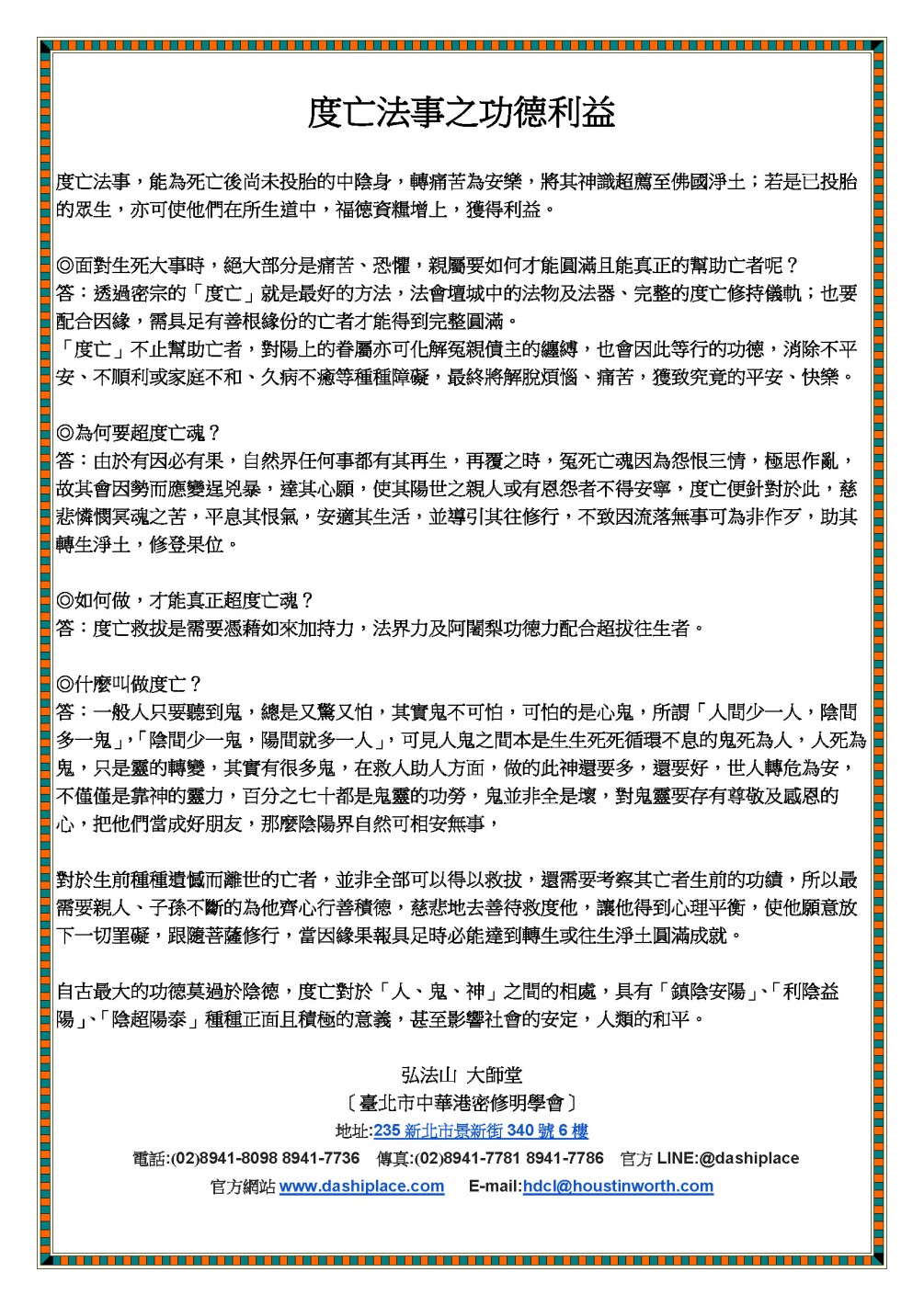 我們每一個人,就如同一盞明燈,度亡法事參與人員越多,光就越亮,利益亡者的功德就越大,同時又能為自己消除業障 ,所以不應輕忽自己的角色,需知護法的功德不可思議!不但能為自己累積廣大的福慧資糧更能庇蔭到自己的家人!