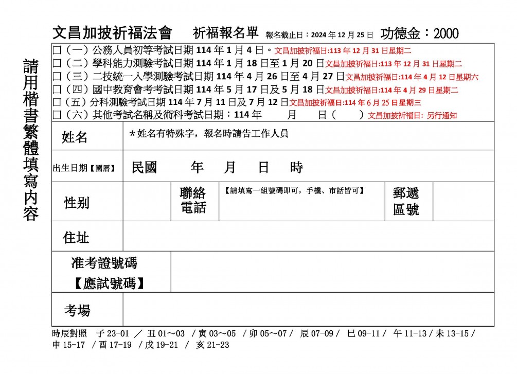 【文昌加披祈福大法會】 ※特別針對考生所報名的考期,為考生祈福,請務必在報名表上填入參加的考試名稱及日期。報名截止日:2024年12月25日