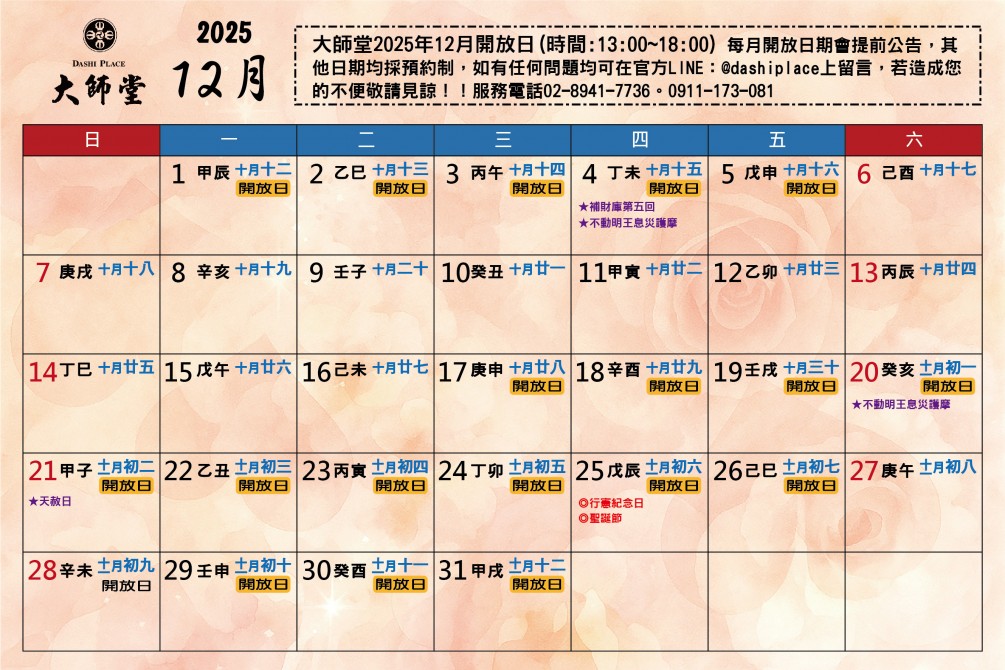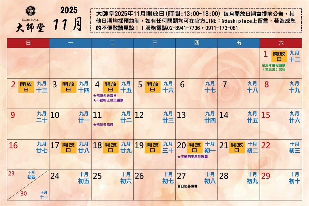 大師堂 自114年5月份起每月開放日期會提前公告,其他日期若想到大師堂參拜及購物均採預約制,如有任何問題均可在官方LINE@dashiplace上留言,購物亦可上官網下單購買。若造成您的不便,敬請見諒!服務電話02-8941-7736。0988-722-138