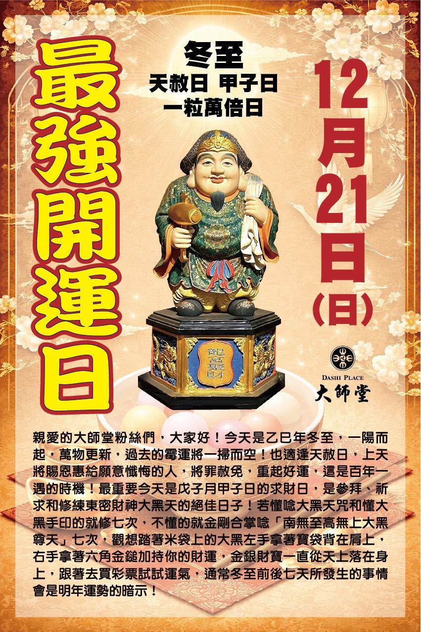 親愛的大師堂粉絲們,大家好!今天是乙巳年冬至,一陽而起,萬物更新,過去的霉運將一掃而空!也適逢天赦日,上天將賜恩惠給願意懺悔的人,將罪赦免,重起好運,這是百年一遇的時機!最重要今天是戊子月甲子日的求財日,是參拜、祈求和修練東密財神大黑天的絕佳日子!若懂唸大黑天咒和懂大黑手印的就修七次,不懂的就金剛合掌唸「南無至高無上大黑尊天」七次,觀想踏著米袋上的大黑左手拿著寶袋背在肩上,右手拿著六角金鎚加持你的財運,金銀財寶一直從天上落在身上,跟著去買彩票試試運氣,通常冬至前後七天所發生的事情會是明年運勢的暗示!
