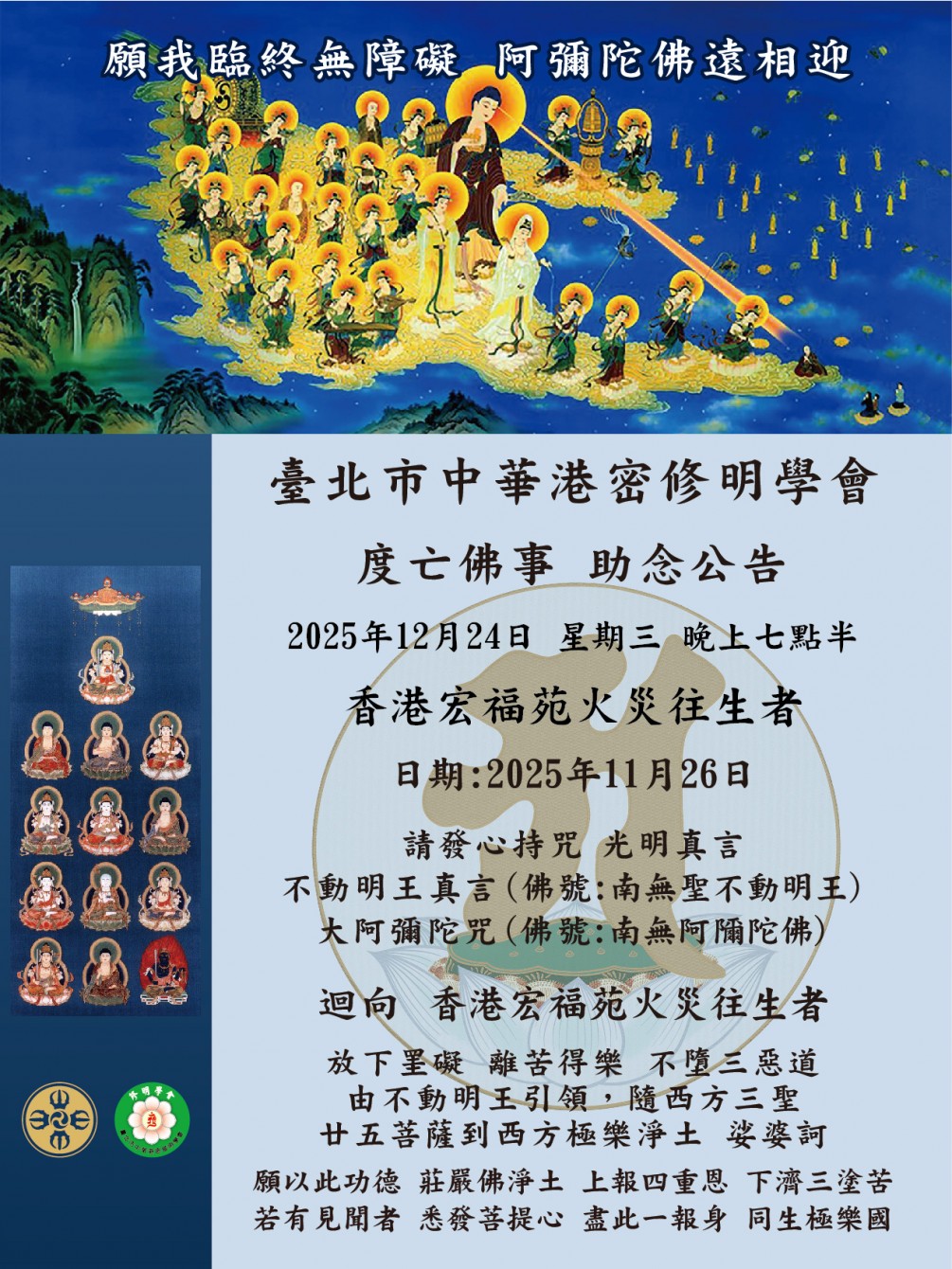 度亡佛事 公告【2025年11月26日在香港宏福苑火災往生者】謹訂於2025年12月24日(星期三)晚上七時三十分