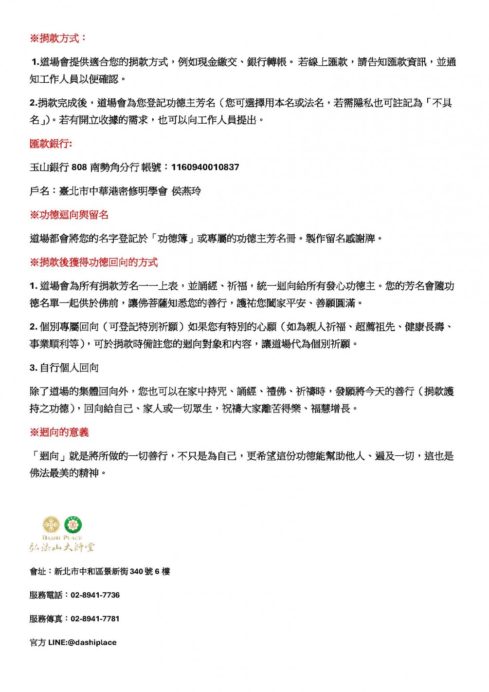 2. 個別專屬回向(可登記特別祈願)如果您有特別的心願(如為親人祈福、超薦祖先、健康長壽、事業順利等),可於捐款時備註您的迴向對象和內容,讓道場代為個別祈願。