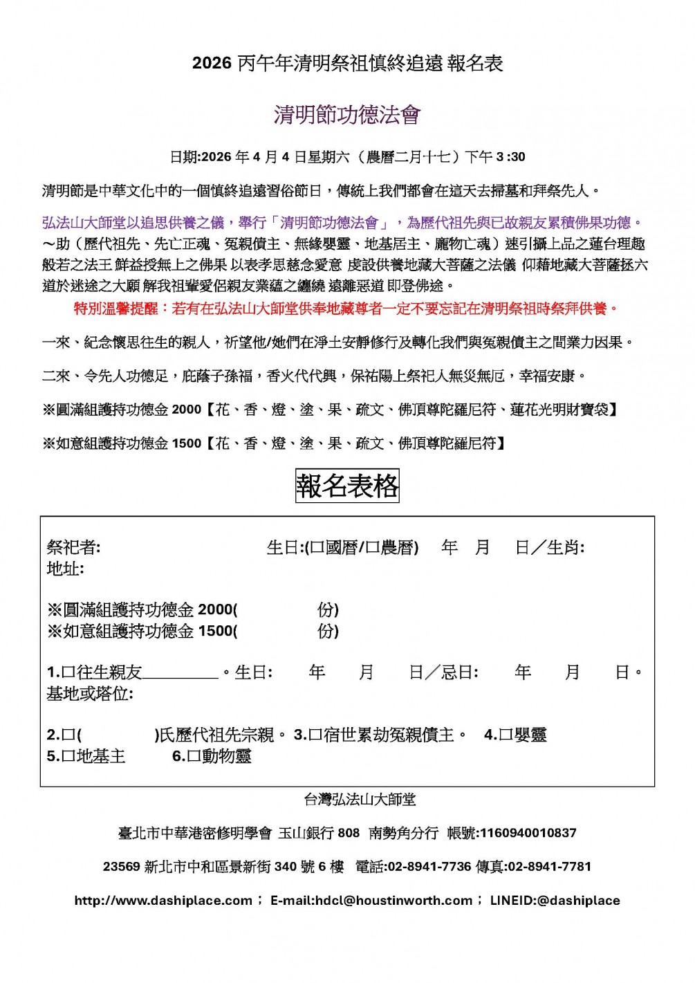 2026丙午年清明祭祖慎終追遠 「清明節功德法會」 日期:2026年4月4日星期六 (農曆二月十七)下午3 :30